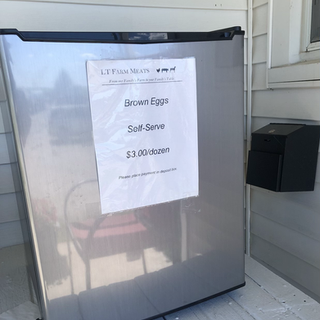 Eggs are now available for 24/7 pickup on our farm office porch with no prior notification needed. Simply stop by our office whenever it is convenient for you and pick up your eggs from our minifridge located by our meat freezer on the farm office porch. You can place your payment in the secured deposit box to the immediate right of the refrigerator. We will keep this refrigerator stocked with eggs.